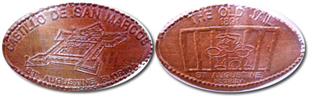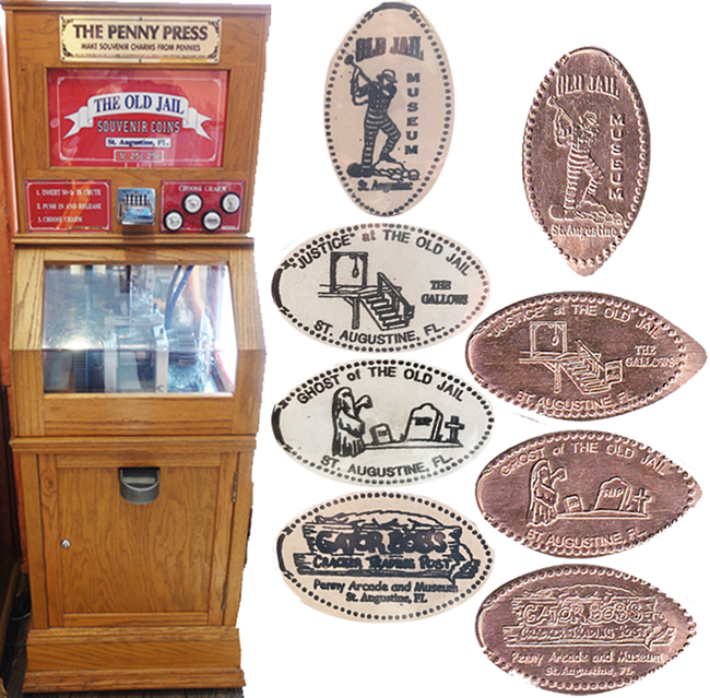 Machine 2 electric 4 penny machine located inside Gator Bob's Trading Post next to the Old Jail Ticket Booth. The penny machine is located in a hallway to the restrooms to the right as you enter the store. Cost to press: 51¢ each design. Designs all have 'HM' at the catch notch and a beaded border with 'St. Augustine'.