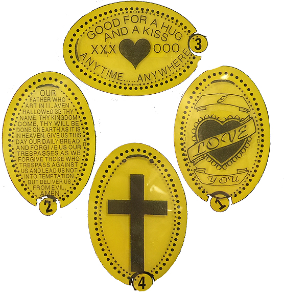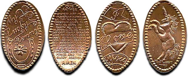 Retired 1: 1) Unicorn with no wording, 2) I Love You with heart, 3) My Lucky Penny with shamrock & Horseshoe, 4) Lord's Prayer