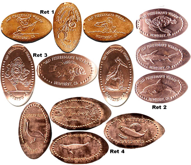 Retired 4 (2012), 1) 'Monterey Sardines', Sardine, peppers and tomato, 2) 'Monterey, California', Sea Lion, 3) 'Greetings from Monterey, California', Otter head and Cypress Tree, 4) 'Cannery Row Monterey, CA', Pelican