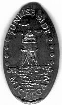 1) 'Sunrise Side, Michigan', Alpena Lighthouse with a second impression on the back of the penny the words 'Alpena MI'