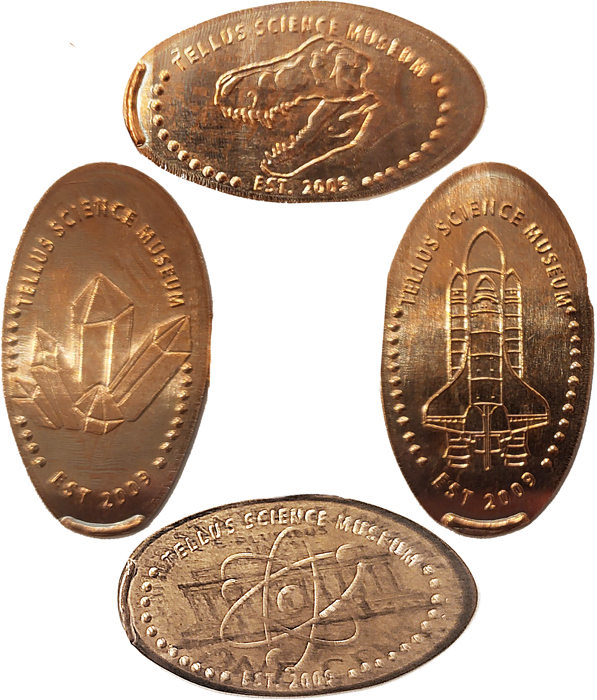 Machine 2 is located at the entrance in front of the gift shop and has four pennies. Each penny has the words 'Tellus Science Museum' at the top and 'Est. 2009' at the bottom. Designs are: :
