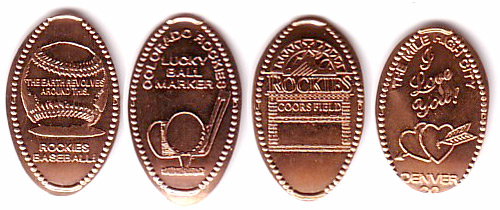 Retired designs: 1) (V) Baseball with 'The Earth Revolves Around This' and 'Rockies Baseball' below. 2) (V) Golf club and ball with 'Colorado Rockies Lucky Ball Marker'. 3) (V) Mountains with 'Rockies Coors Field'. 4) (V) Arrow through two hearts with 'The Mile High City Denver CO I Love You!'.
