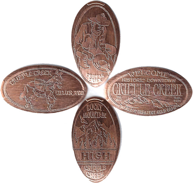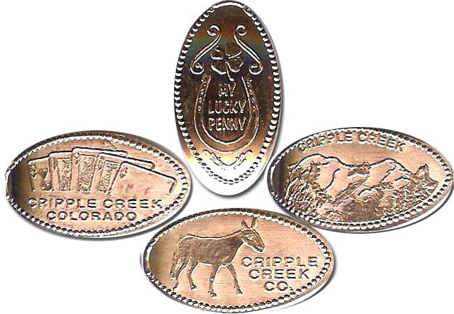 Retired 1: 1) mountain scene "Cripple Creek", 2) photo of mule "Cripple Creek Co.", 3) Royal Flush cards "Cripple Creek Colorado", 4) shamrock and horseshoe "My Lucky Penny".