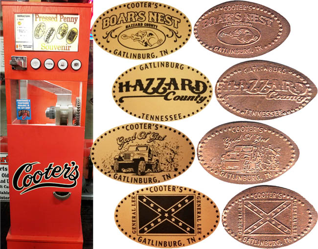 Retired 2: 1) Says "Hazard County" on it with Gatlinburg and Tennessee surrounding it, 2) Has a Confederate Flag on it with General Lee on each side. Cooter's on top and Gatlinburg, TN on bottom, 3) Has Boar's Nest w/ Logo, Cooter's on top, Gatlinburg, TN on bottom, 4) 'Good Ol' Girl", Daisy's Jeep.