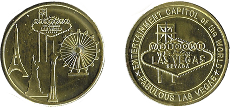 Retired from Token Machine 3: 1) 'Welcome to Fabulous Las Vegas Nevada', welcome sign, Linq Farris Wheel, Eifel Tower, Statue of Liberty, Strat Tower/ Rear- Welcome sign 'Entertainment Capital of the World, Fabulous Las Vegas'. Las Vegas Welcome sign with sayings around top and bottom,