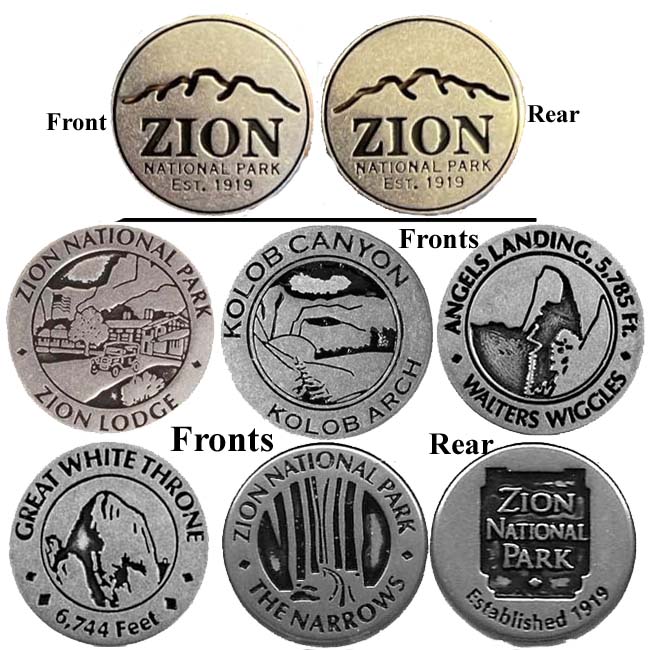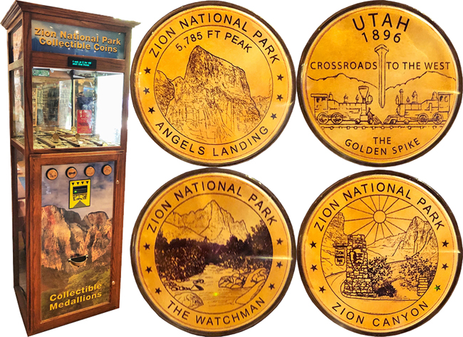 Machine 1 is just beyond the door between gift shop and café. Machine has been converted to preloaded zincs, 1$ each with the same design 'Zion National Park'. on each.