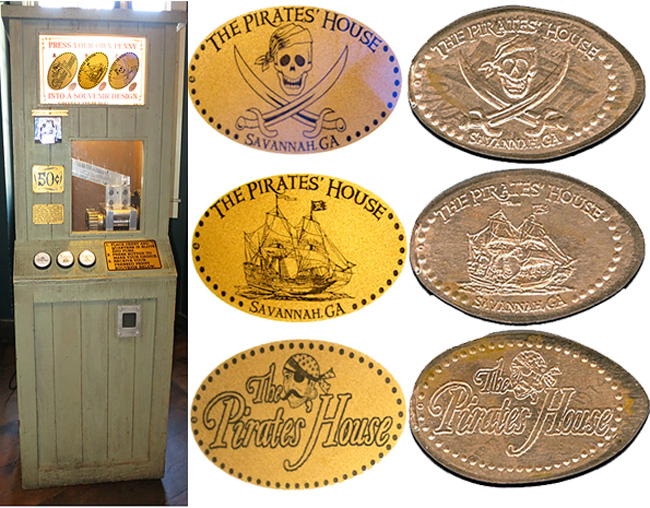 The machine is right inside the main entrance. All have The Pirates House' on them. The Designs are: