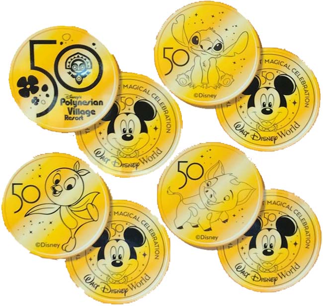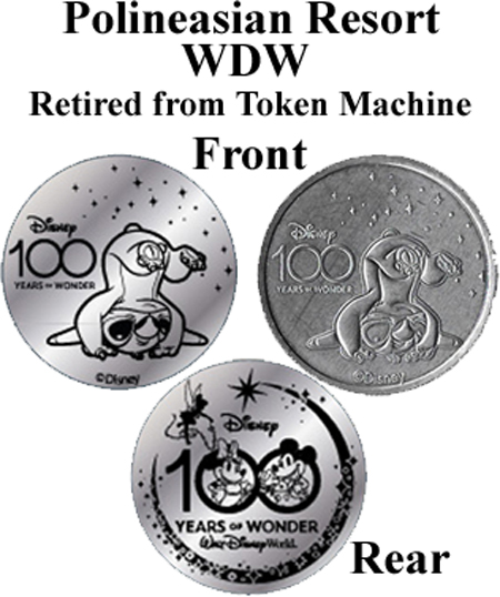 Retired Token machine 2: ('50 Anniv Tokens)1) 'Disney's Polynesian Village Resort', 2) Stitch sitting facing forward, 3) A cartoon Chick dancing, 4) A cartoon pig.