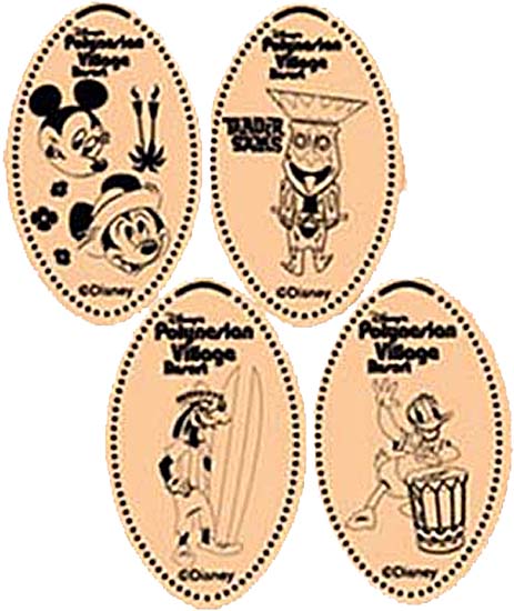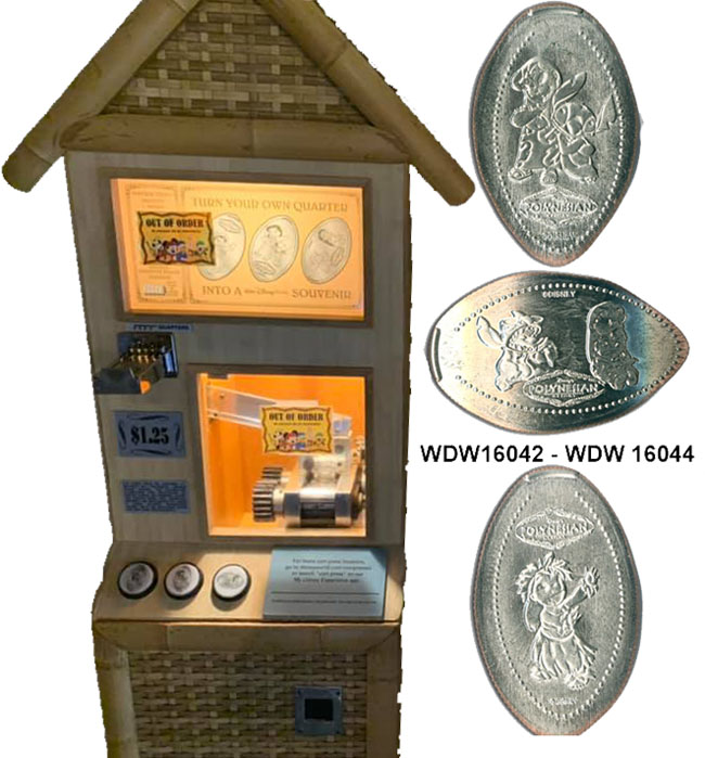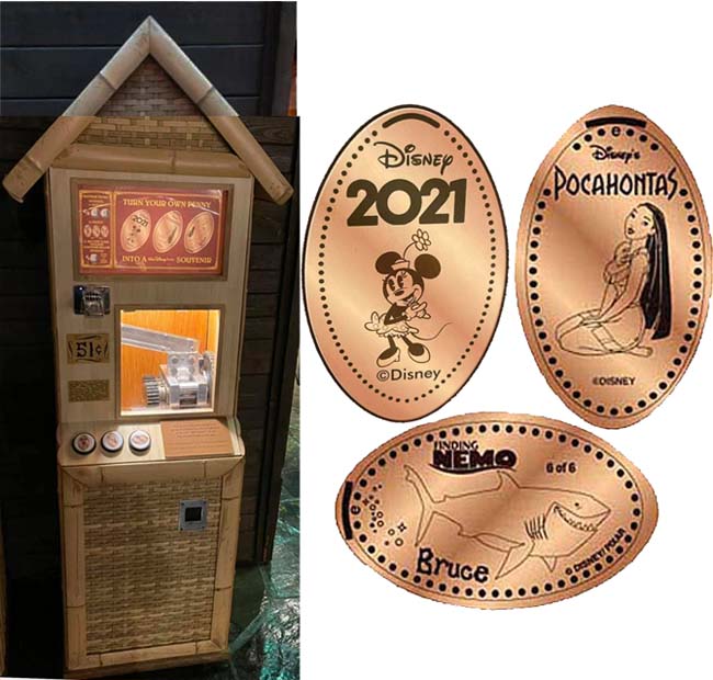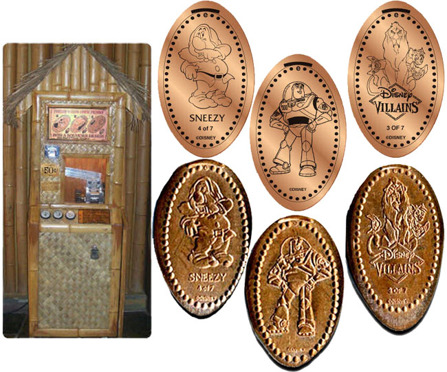There are many machines throughout Walt Disney World (a mix of Eurolink and Pennycollector) and they change constantly. No one list is accurate or complete, so please use the information here as a guide only. You may want to consult James' very fine listings available at www.presscoins.com before venturing out. And once in the park, you may also want to ask for a listing at Guest Services. Finally, if you've come unprepared and need quarters or pennies, the various shops are generally willing to help you out