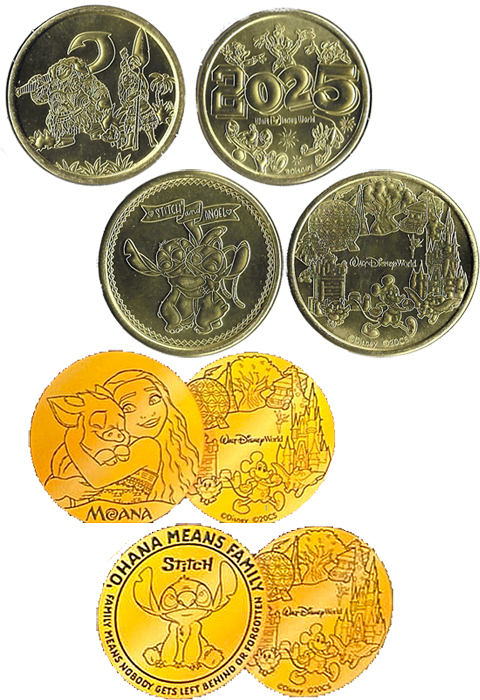 4) Maui holding his big hook left of Moana/ Rear, '2025 Walt Disney World', Goofy, Donald, Minnie, Mickey and Pluto around outside of token with date and park name inside