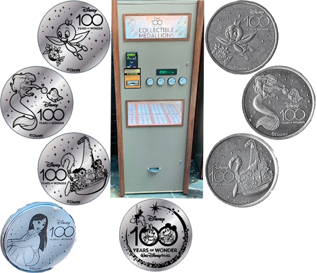Retired Token Machine 3:(2023) 100 Year of Wonder tokens: 1) Mulan sitting, 2) Orange Bird flying up left, 3) Ariel and Flounder, 4) Moana & Maui on a boat