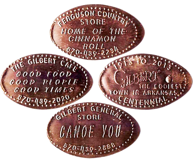 Retired 1: 1) Ferguson Country Store, Home of the Cinnamon Roll 870-439-2234', 2) The Gilbert Cafe, Good Food, Good People, Good Times 870-439-2020', 3) 1913 to 2013 Centennial, Gilbert, the Coolest Town in Arkansas'. 4) Gilbert General Store, Canoe You, 870-439-2888'.