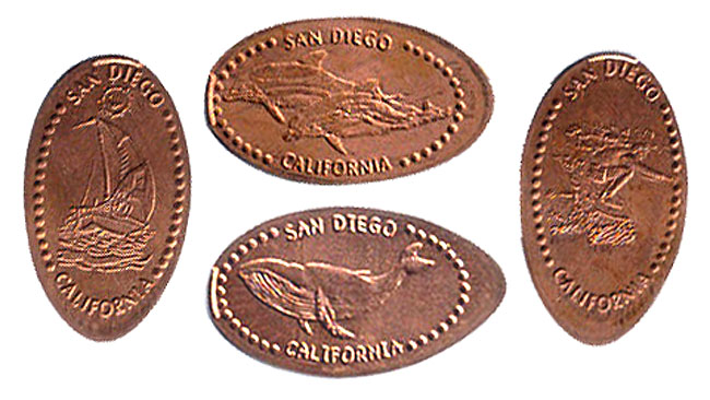 Retired 7: 1) 'Hello From San Diego', Orca and Dolphin, 2) 'San Diego, California', Skyline, 3) 'Gaslight District San Diego, California', District entrance sign, 4) 'Greetings from San Diego', Elephant, Panda Bear, Lion.