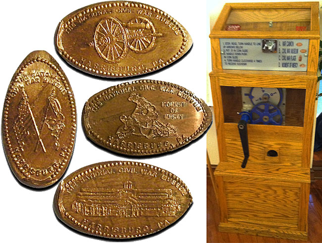 Machine is a hand crank with four designs. All designs have "The National Civil War Museum" across the top, and "Harrisburg, PA" across the bottom., Designs are: