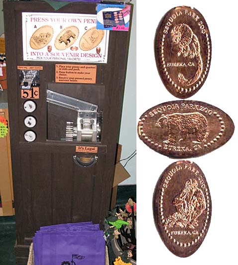 The machine is located to the right of the Zoo entrance in the Gift Shop and no entrance fee is required. All have 'Sequoia Park Zoo Eureka CA' on them. Designs are: