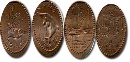 I love you Florida with heart and arrow, Fun & Sun Florida with dolphin, Orlando Florida with sunset, sailboat and flamingo and Souvenir of Florida the Sunshine State with sun and state map. |
