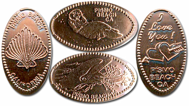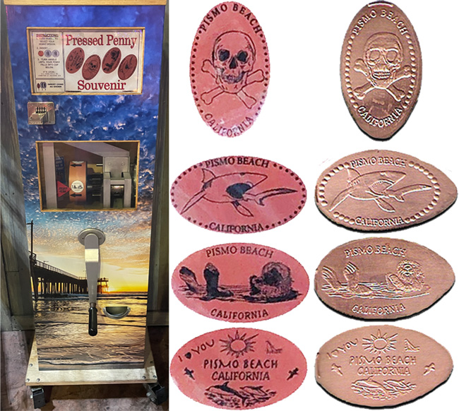Machine 2 (Placed 5/09) is outside in front of the store. Cost to press: 51¢ each design. Designs 1 and 2 have a beaded border and all designs with 'Pismo Beach California':