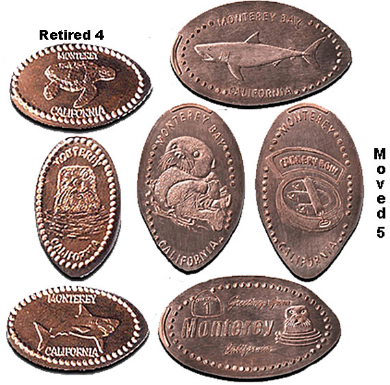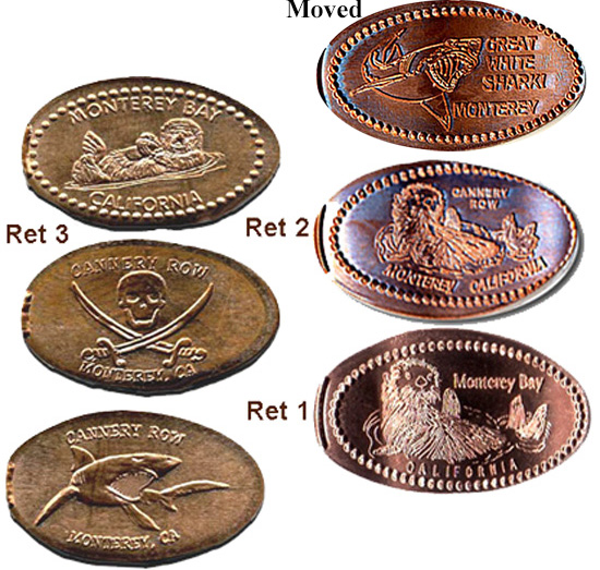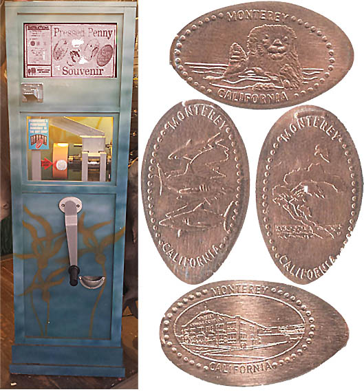 810 Cannery Row Monterey, CA This Shop is located near the end of Cannary Row, toward aquarium past Bubba Gumps and across from Mackerel Jack's Trading Co. They also sell one souvenir penny book, Blue outlined in bright blue dots with 4 pictures: a Jellyfish, Sea Turtle, Shark, and Seal.
