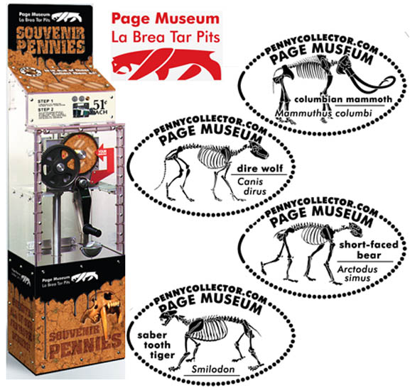 Retired 4 designs all with 'PennyCollector.com Page Museum': 1) Mammoth skeleton with 'columbian mammoth Mammuthus Columbi 2) Dire wolf skeleton with 'dire wolf Canis Dirus' 3) Bear skeleton with 'short-faced bear Arctodus Simus' 4) Sabertooth tiger skeleton with 'saber-tooth tiger Smilodon'