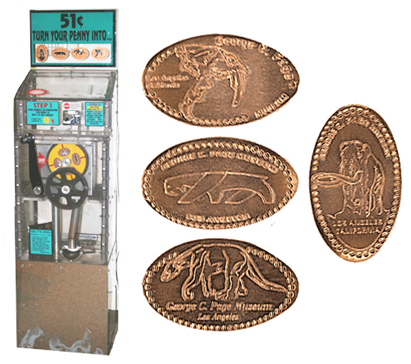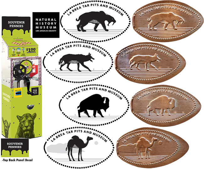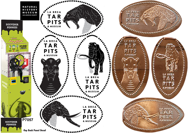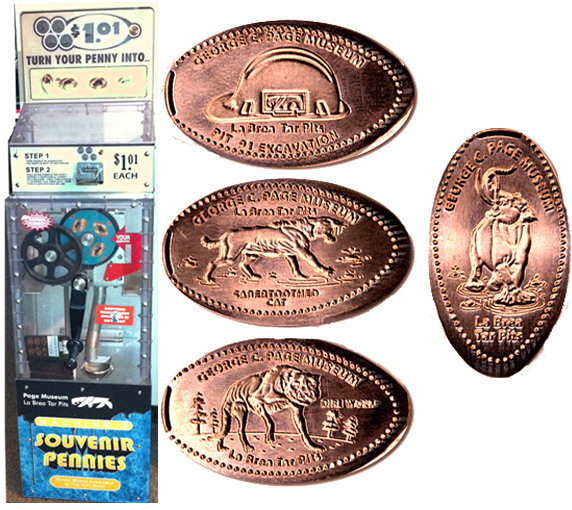 Machine 6 (Placed 11/2017) is near the restrooms, just before the 3D theaters. Cost to press: $1.00 for each design on pre-loaded zinc pennies. Designs all with 'La Brea Tar Pits and Museum':