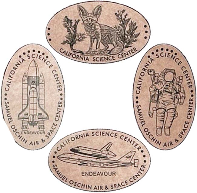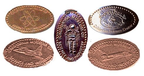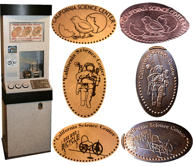 Machine 1: downstairs in the main souvenir shop. All have 'California Science Center' on them. Designs are: