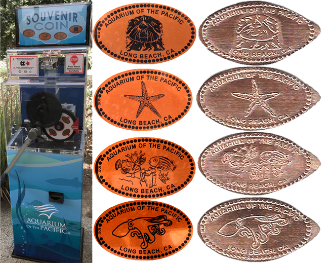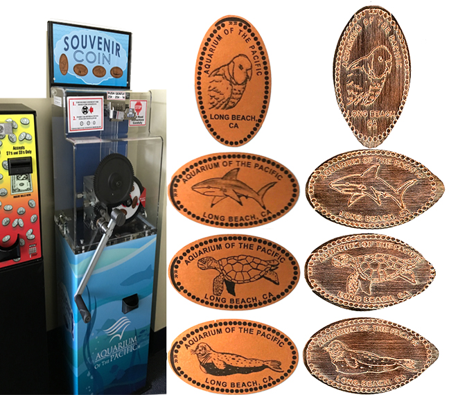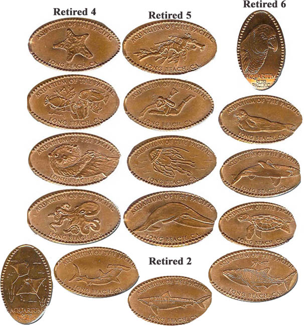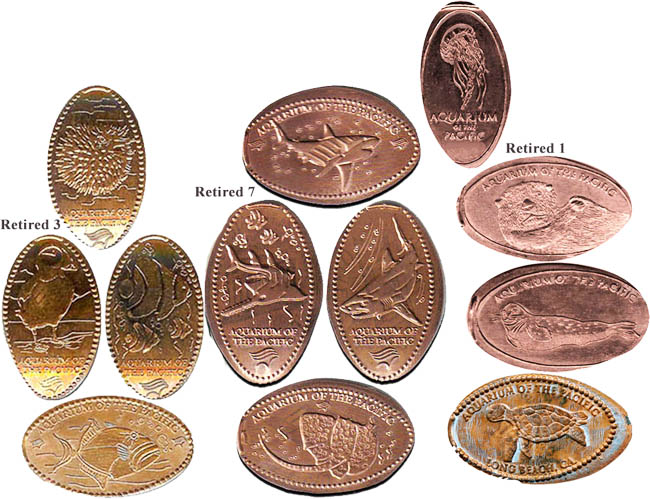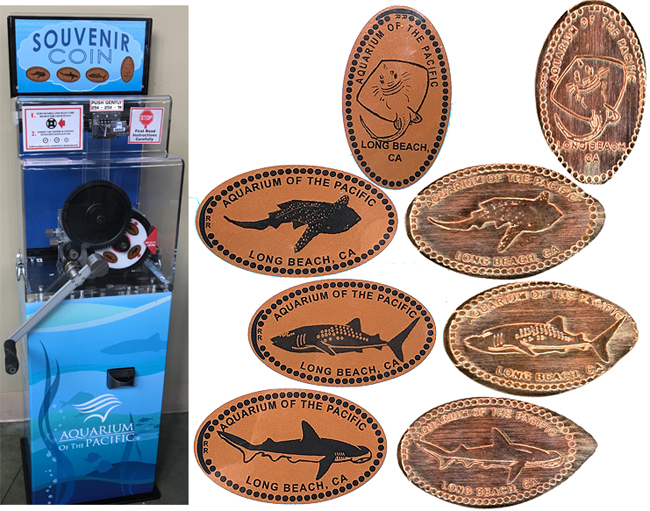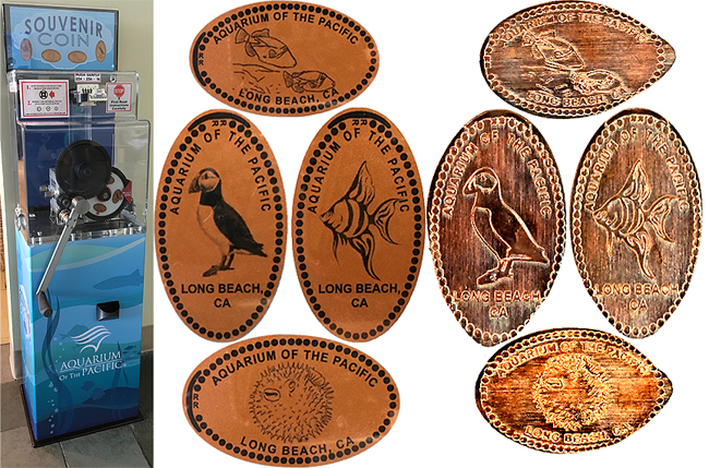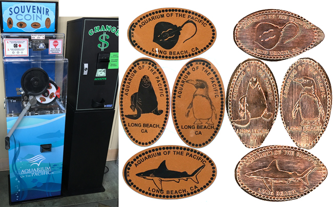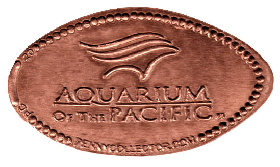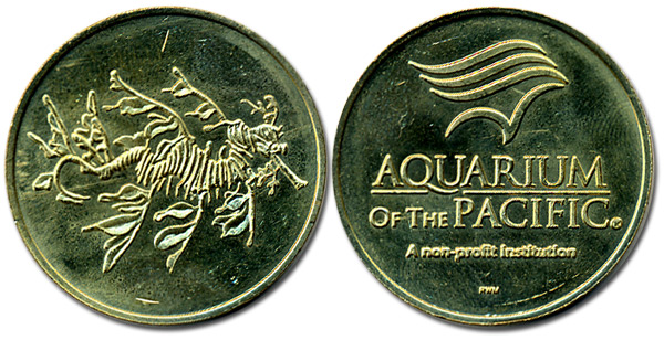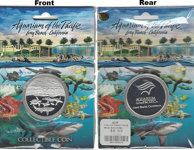 1) It looks like it made from polished aluminum or zinc. The obverse side has a view of the Aquarium of the Pacific as if you were viewing it from the ocean. The top half of the design is the Aquarium of the Pacific building and the new Pacific Visions wing (currently under construction). The bottom half of the design are a few sea creatures swimming around underwater, namely a Sea Turtle, a Ray, a Sea Lion, some fish, and a Shark. The reverse side simply has the aquarium's logo and the words "Aquarium of the Pacific Long Beach California".