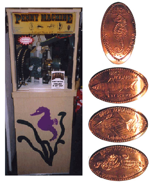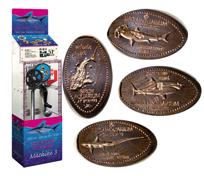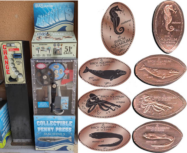 Machine 3: Located outside the restrooms, next to the gift shop. Cost to press: 51¢ each design. Designs all have a beaded border with 'Birch Aquarium At Scripps':