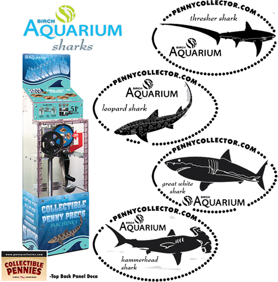 Machine 6: Located out in the tent by the Shark tank. Cost to press: 51¢ each design. Designs all have a penny collector.com beaded border with 'Birch Aquarium':