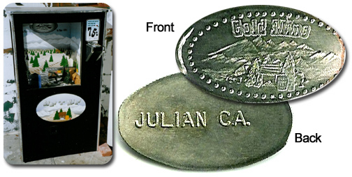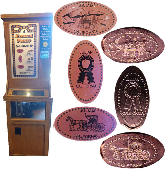 Machine 2 is just inside the right entrance to the right. Cost to press: 51¢ each design. Designs all have 'Julian California' on them: