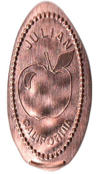 Retired 2: Raised image Apple “JULIAN” at top “CALIFORNIA” at bottom, dot border, die broke in test phase (v)