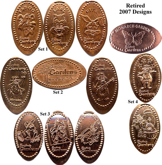 Retired 4: 1) 'Monarch Gardens', 2) Bear standing with stars over, 3) Steam train engine.
