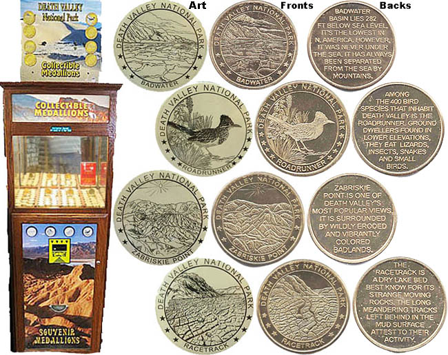 Retired Token Machine 1: Fronts all had 'Death Valley National Park' : 1) 'Badwater', Image of the Badwater area, 2) 'Roadrunner', on a branch facing right, 3) 'Zabriskie Point', the image of the Point area with the sun over, 4) 'Race Track', Tracks in the desert floor made by the rocks rolling on their own.