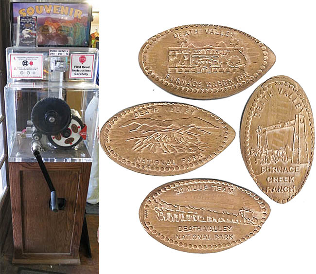 Available at the Visitor Center is the Death Valley National Park token book ($4.99). This book is designed to hold the pewter national park tokens (about the size of a nickel), but will easily fit smashed pennies -- there are enough spaces in the book to hold all pennies available in Death Valley, including the machines at Furnace Creek Ranch and the new machines at Stovepipe Wells.