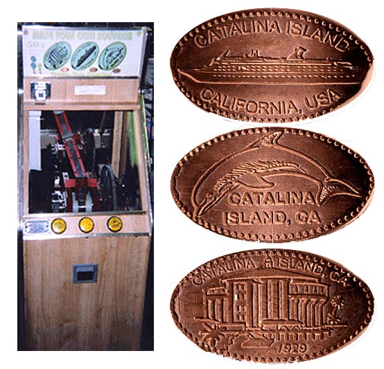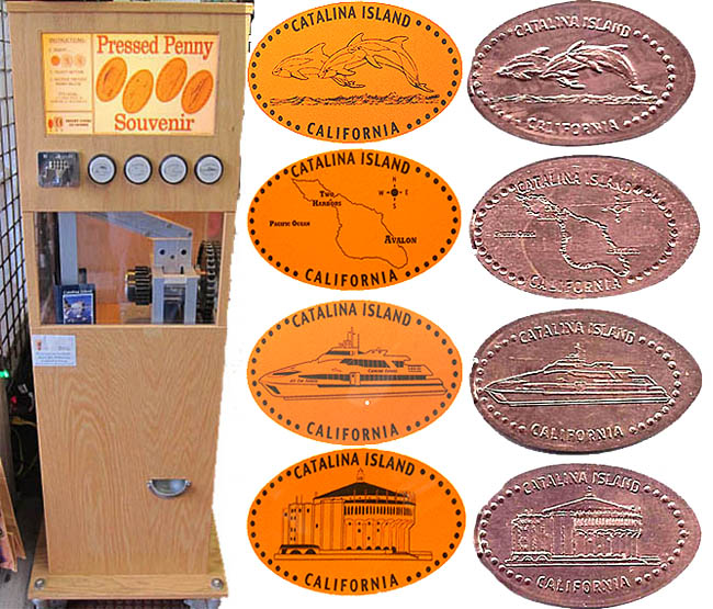 Machine 3 is just inside the front door to the left. Cost to press: 51¢ each design. Designs all with 'Catalina Island California':
