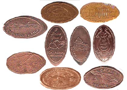 Retired Older designs: 1) Cruise Ship, 2) Image of Island, 3) 'I Love You Catalina Island', 4) 'My Lucky Penny Catalina Island', 5) Image of Hotel (V), 6) Image of Casino, (H), 7) Dolphin coming from left mouth open, 8) Dolphin jumping left over Island name, 9) Area with sunset, Seal, Hotel building, ETC