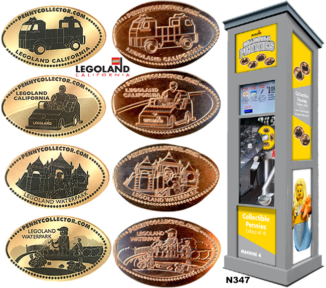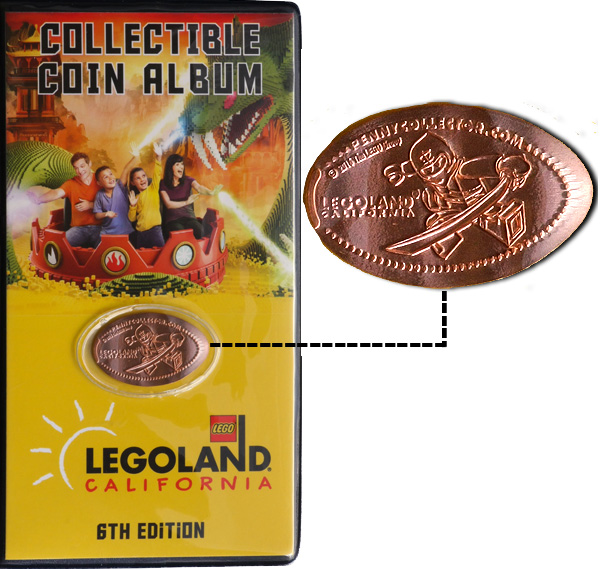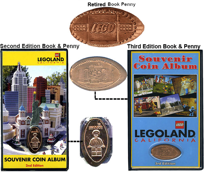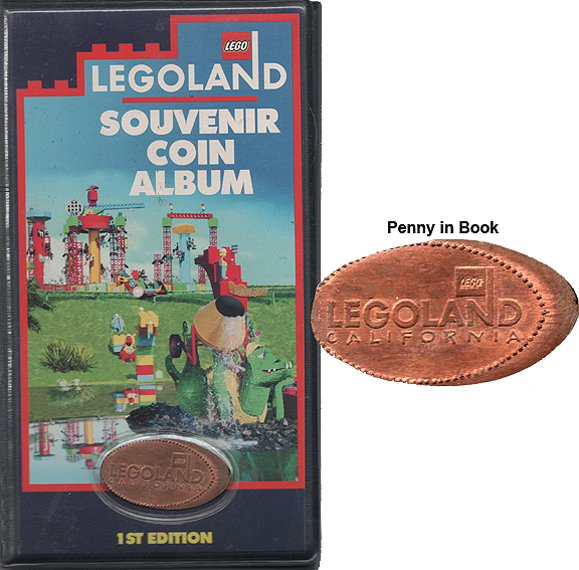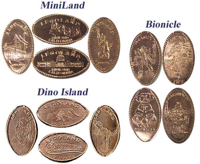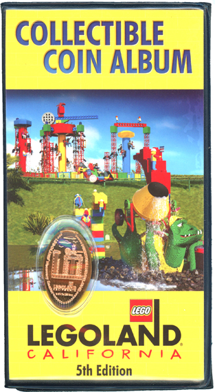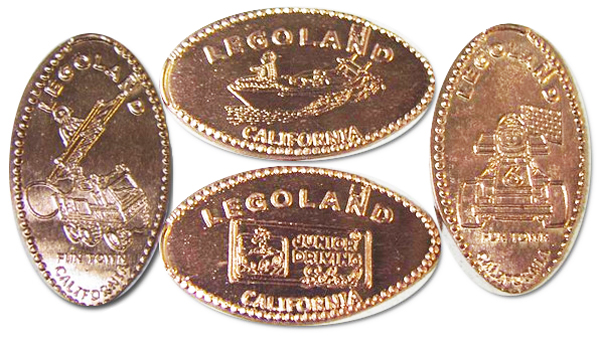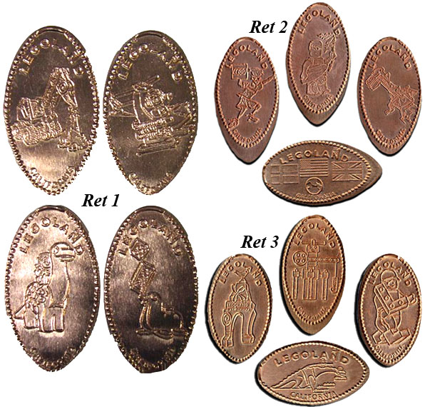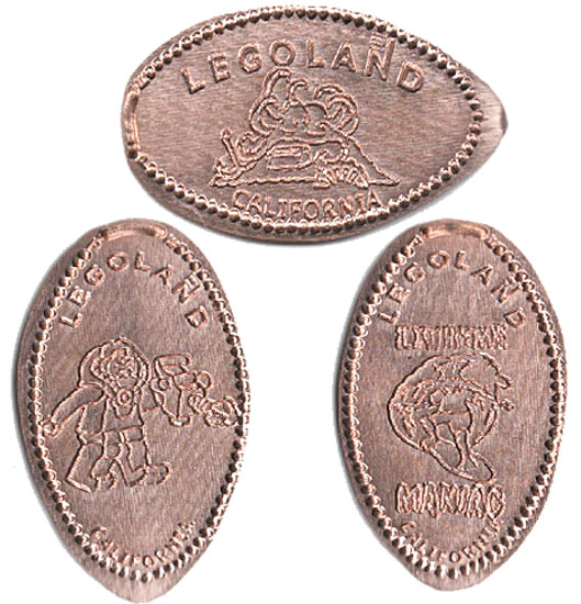 Retired 2 - 2010: 1) (H) Danish, American and British flags above globe, "LEGOLAND CALIFORNIA". 2) (V) Buddy w/sunglasses and surfboard, waving, palm tree behind him, "LEGOLAND CALIFORNIA" 3) (V) Mechanical Lego tyrannosaur (from Maniac Challenge), "LEGOLAND CALIFORNIA", 4 0 (V) Kid carrying Lego sign in right hand, "LEGOLAND CALIFORNIA"