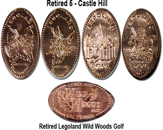 Retired 5 - 2010 Castle Hill: 1) (V) Lego King riding charger w/raised sword, "LEGOLAND CASTLE HILL CALIFORNIA", 2) (V) Two Lego knights w/raised swords facing each other, "LEGOLAND CASTLE HILL CALIFORNIA", 3) (V) Castle, "LEGOLAND CASTLE HILL CALIFORNIA", 4) (V) Wizard riding dragon, "LEGOLAND CASTLE HILL CALIFORNIA"