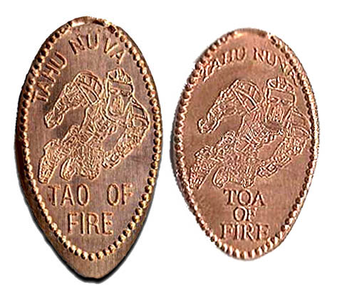 Then an astute 8-year-old and his dad went to Legoland on vacation, The son is a huge Bionicle fan, a big fan of Logos, of course they got the pennies from Legoland's Bionicle and the other Lego machines. They enjoyed the rest of the Park and later that night looked at the coins he pressed. He right away noticed that the coin that read 'Tahu Nuva' 'TOA' of Fire had the wrong engraved character on it. The engraved character (On both the 'TAO' and TOA' designs) was actually 'Matau the TOA of Air' from the 'TOA Metru' collection in his flying pose (Dad confirmed this). They notified Legoland by letter and Legoland apparently taped over the 'TOA of Fire picture on the Bionicle machine and shortly there after, retired the machine.