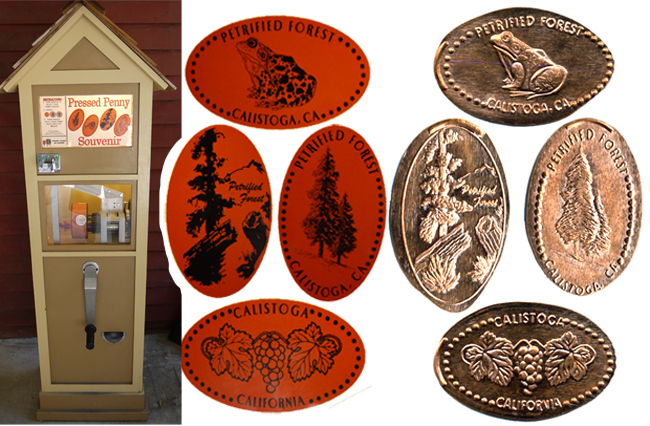 Machine 2 is out the back door of the Gift Shop on the patio. Cost to press: 51¢ each design. Designs: