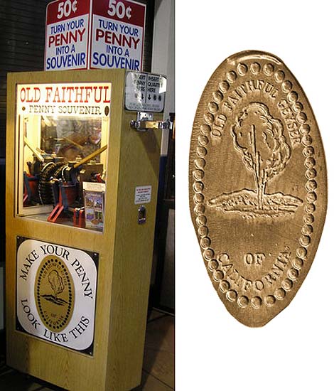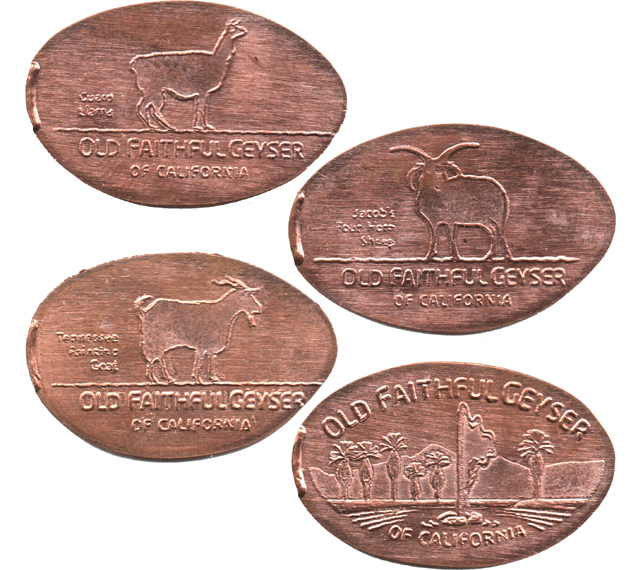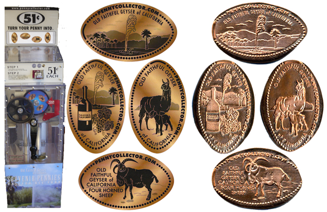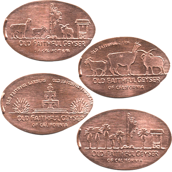 Machine 4 (Placed 2016) outside the Gift Shop by the geyser. Cost to press: 51¢ each design. Designs all with 'Old Faithful Geyser of California':