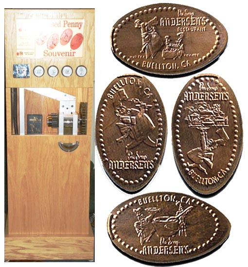 Machine 2 (Placed 2009) The penny machine is in the gift shop front entrance. Cost to press: 51¢ each design. Designs all with 'Pea Soup Andersen's Restaurant Buellton, CA':