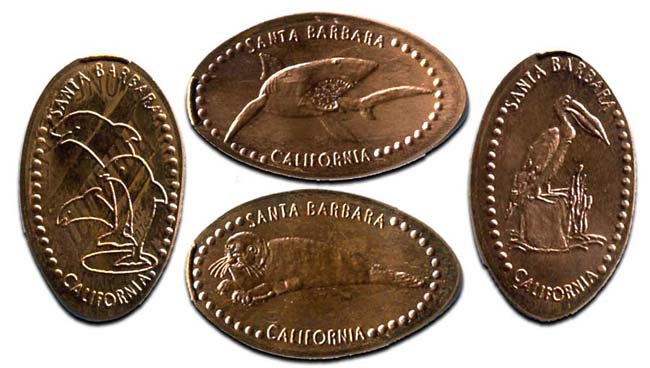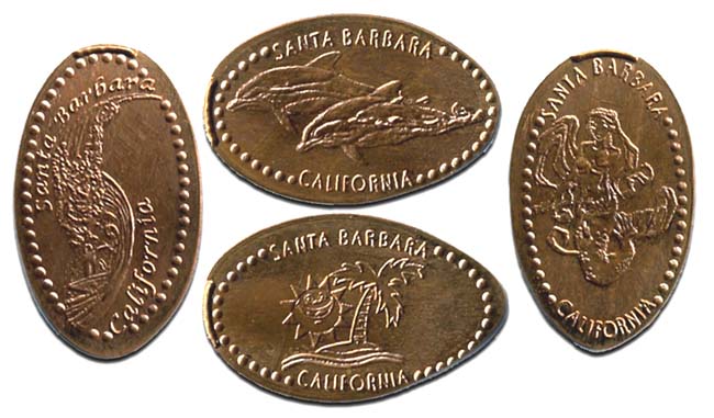 Retired 2: 1) Palm Tree' 2) Two seals, 3) 'Santa Barbara', the wharf, 4) Two Dolphins jumping.