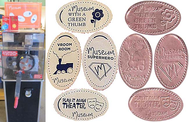 Machine 2, is located inside to the right in front of the Gift shop. all have a beaded border' and cost 50 cents (two quarters only) on a penny that you supply to press: