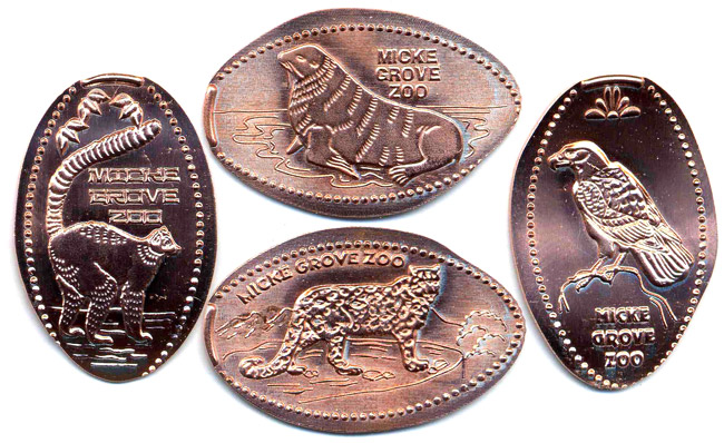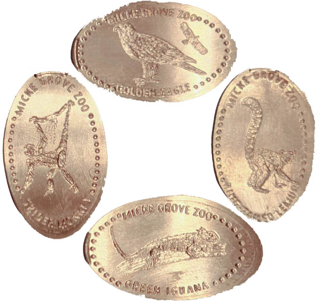 Machine 2:All have 'Micke Grove Zoo' on them. Designs are: