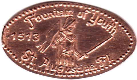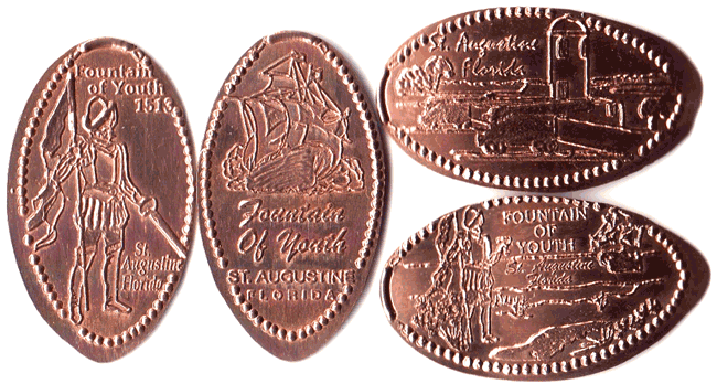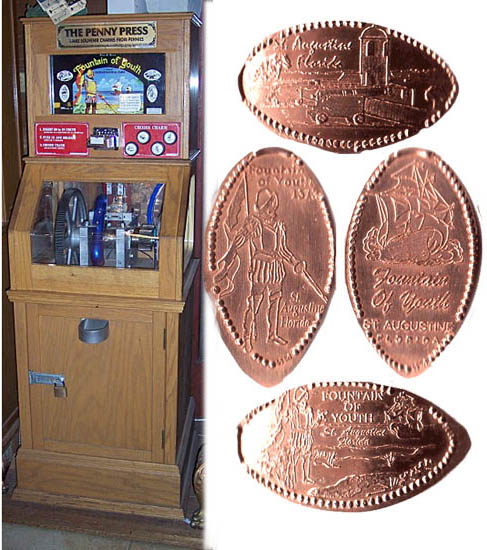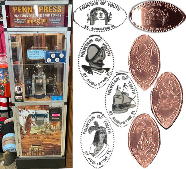 Machine 5 is in the middle right of the gift shop. Cost to press: $1.00 each design (dollar bills only; no quarters accepted) that presses a pre-loaded zinc penny. Designs all have 'Fountain Of Youth St Augustine FL' on them: