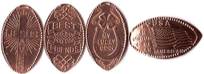 Retired 3 designs had 'JJ' at the catch notch: 1) (V) Rays behind a Christian cross with 'Jesus Saves', 2) (V) Ornate scrolling with 'Best Friends', 3) (V) 4-Leaf Clover above a Horseshoe with 'My Lucky Coin', 4) (H) Waving American Flag with 'USA I Am Proud To Be An American'.