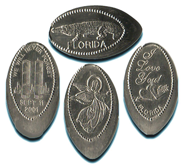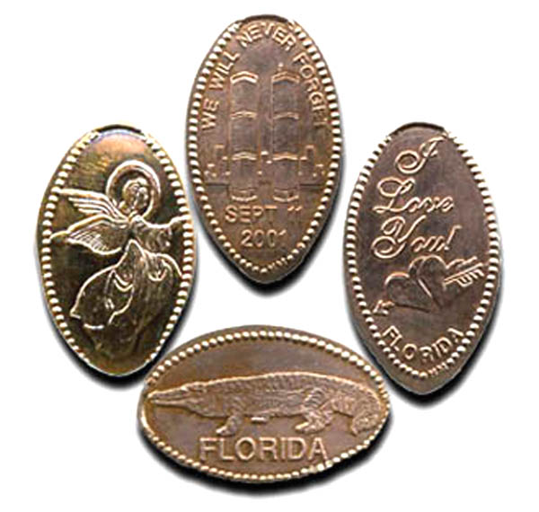 Machine 1A - Retired Penny designs all have 'MM' at the tail with a beaded border: 1. (V) Twin Towers with 'We Will Never Forget Sept 11 2001', 2. (V) Guardian Angel, 3. (V) An arrow piercing two hearts with 'I Love You Florida', 4. (H) Alligator with 'Florida'.