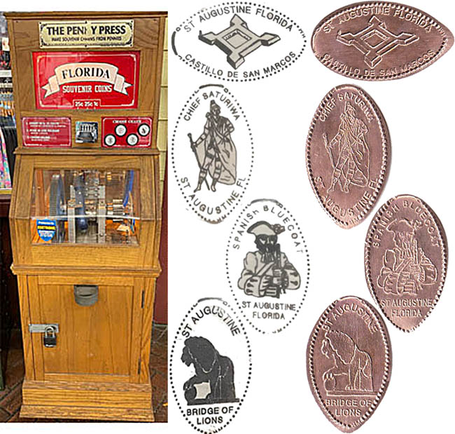 Machine 2 is inside the common walkway next to suite #12 Cotton World. Cost to press: 51¢ each design. Designs all have 'JD' at the catch notch and a beaded border with 'St Augustine':