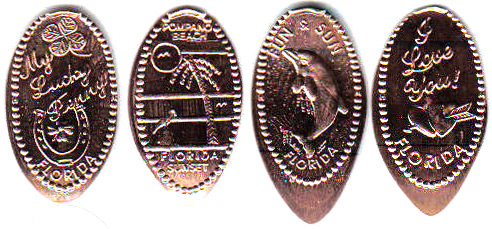 Designs: 1) My Lucky Penny Florida with horseshoe and 4 leaf clover; 2) Pompano Beach Florida Sunset with palm tree and sun; 3) Fun & Sun Florida with dolphin; and 4) I Love You Florida with hearts. |