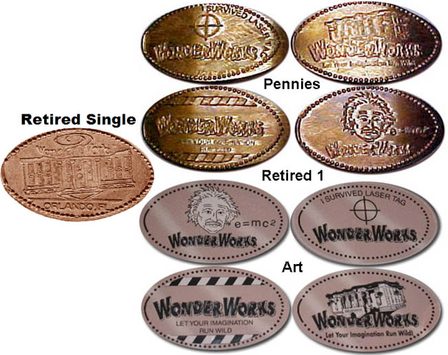 Retired 1: (Single) 1) 'WonderWorks Orlando, FL', Upside Down building with spiral over.
